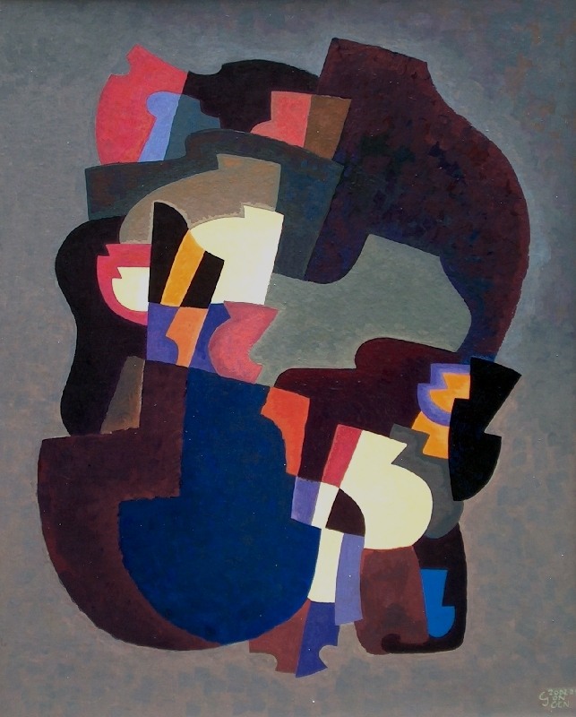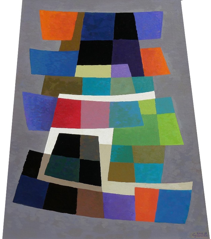 P085b Esprit protecteur, Protective spirit, 2016-17, huile sur bois, 51/65 x 75 cm en dessous : P052c Opposés en diagonale, Diagonally opposite, 1999-2001, huile sur bois, 72 x 57 cm