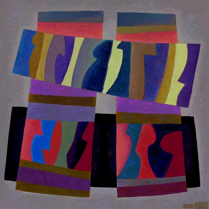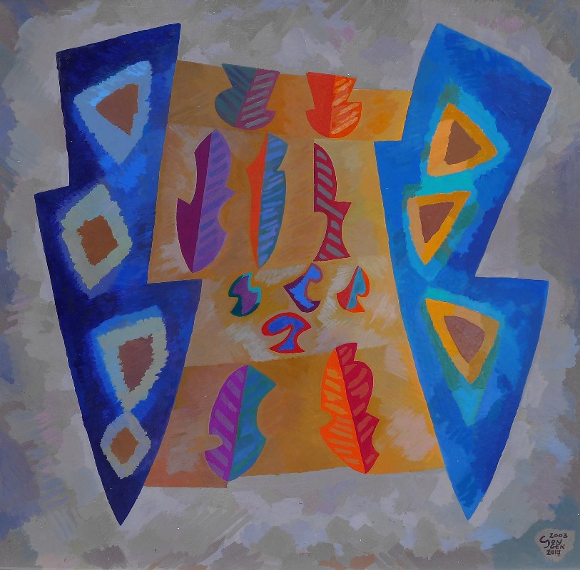 P047c Blason, noir orange bleu - Blazon, black blue, huile sur bois, 51 x 51 cm en-dessous P051c Deux affrontés, bleu orange rouge, 2006 - 2017, huile sur bois, 65 x 65 cm