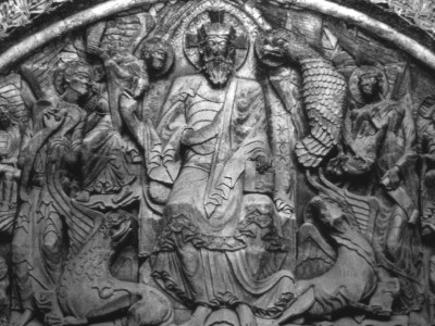 Le Christ entouré du tétramorphe. Portail de l'église abbatiale