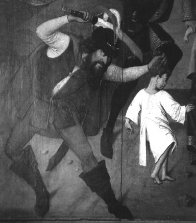 Peut-on embellir le mal? La transformation esthétique n’est pas intrinsèquement liée à l’éthique. Au contraire, sa capacité à s'emparer de tous les sujets est flagrante. Le pouvoir de l'association est redoutable. Si l'on extrait de son contexte le soldat qui trucide le bébé à l'avant plan de la peinture polonaise, Le massacre des Innocents, on obtient un portrait d'assassin fulgurant. La silhouette agile, le chapeau avantageux, l'œil pétillant à la perspective du massacre séduisent. La liberté de cette gesticulation fascine, induit une émotion de toute puissance irréelle. Les mécanismes d’identification se mettent en branle tout naturellement. L’approbation de ce criminel suivrait aussitôt si la conscience morale du spectateur ne rectifiait l'attirance. Mais pouvons-nous avec certitude nous fier à ce scénario ? L'emprise du beau pose une question délicate. Non seulement on est obligé de constater que tout le monde n'est pas désarmé, mais en outre, ce serait trop vite conclure que le sens des œuvres est le même pour tout un chacun. Dans la fierté d'un guerrier, les brutes et les rusés voient confirmés leurs appétits de domination, les doux se désolent de l'existence du mal. Il n'est pas exclu que le beau puisse faire l'apologie de la barbarie... Aussi, mieux vaut penser que l'art n'est pas lié à la vertu par magie. Ce lien doit être décidé. Il est préférable de sélectionner les contenus en fonction de son pouvoir. La forme doit englober le concept de valeur. Elle doit l’intégrer dans l’œuvre de quelque façon. C’est aussi la raison pour laquelle la question de l’exclusion de certains sujets hors du domaine de l’art reste pertinente. Or, notre époque n’entend pas se limiter, et puisque le traitement esthétique de la guerre, même la guerre défensive et héroïque, n'est plus de mise, elle propose de traiter ces sujets autrement.