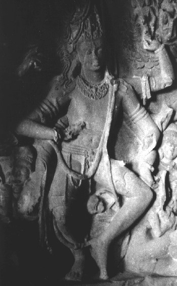 A Elephanta, dès le Ve siècle, le langage atteint des sommets. Rares sont les têtes colossales raffinées, c'est le cas de la Trimurti, tête à trois faces de 5,70 mètres de hauteur dont nous n'avons aucun équivalent en Europe. Les effigies de Gomateshvara, saint vénéré des Jains, pour la plupart des zombies aux yeux exorbités, que ce soit à Sravanabelgola ou sur la colline de Gwalior, les Bouddha gigantesques de Datong et de Longmen, figés et schématiques, nous font mesurer la témérité de cette entreprise. La réussite des artistes de la dynastie des Vakataka est unique. La finesse du modelé à une telle échelle est une performance, et le mot n'est pas vain, car elle nous procure des émotions hors normes. Le spectateur athée actualisera le sens de cette expérience. Planté devant la figure aux paupières closes, il se sentira comme submergé par la présence de la pensée, il éprouvera la puissance de l'auto persuasion. Quittant la Trimurti il sera aussitôt subjugué par la grandeur de Shiva Gangadhar qui, dans un déhanchement gracieux, amortit parmi les boucles de sa chevelure, afin de les ramener sur la terre, les flots du Gange qui avait été détourné de son cour céleste. Circulant parmi les hauts reliefs au plus profond de la caverne, il sera ébahi par l'aisance des corps, souverains dans l'incommensurable comme dans le prodigieux. A Ellorâ où œuvrent